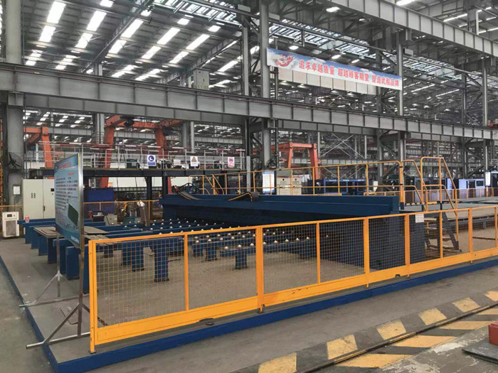 該設備主要由龍門綜合拼板架、物流傳送系統、焊接系統、數據監控系統、集中潤滑系統、電氣控制系統、坡口機、焊接小車及電源和檢修機位手弧焊電源等組成,設備整體區域范圍10m*20m。采用正面液壓琴鍵壓緊、反面加水冷銅套襯墊成型槽的方式進行拼板對接焊接,采用雙絲氣保焊工藝,實現工件單面焊雙面成型。此單面焊雙面成型焊接工藝避免了傳統的兩面焊工件翻身問題,節省場地,降低作業強度,提高了焊接效率,實現流水線焊接,該拼板單面自動化焊接工作站各部分之間可協調動作,采用PLC可編程序控制器集中控制方式,整體設計緊湊,自動化程度高,便于操作。輔助機構配置齊全,可充分發揮整機的性能。