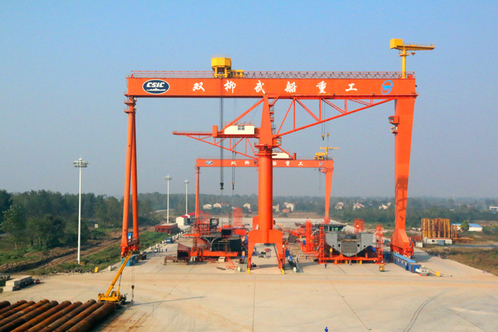 室外船臺(tái)共2座,尺寸為710mX100m,可同時(shí)容納8艘海洋工程特種船進(jìn)行船臺(tái)總裝,擁有300T門式起重機(jī)2臺(tái),40T六座式起重機(jī)2臺(tái)。