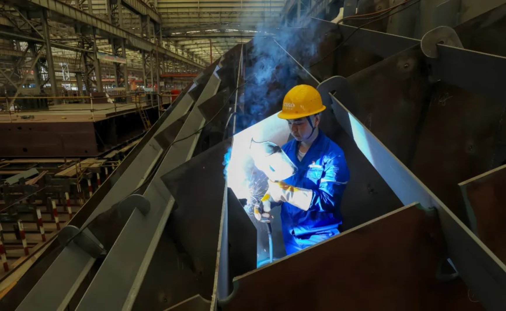 在船臺車間,總能看到一抹深藍(lán)色的身影手持焊槍半蹲半跪,焊接聲“嗞嗞”作響,白色焊煙騰起,焊絲和板件的連接處發(fā)出刺眼的光。