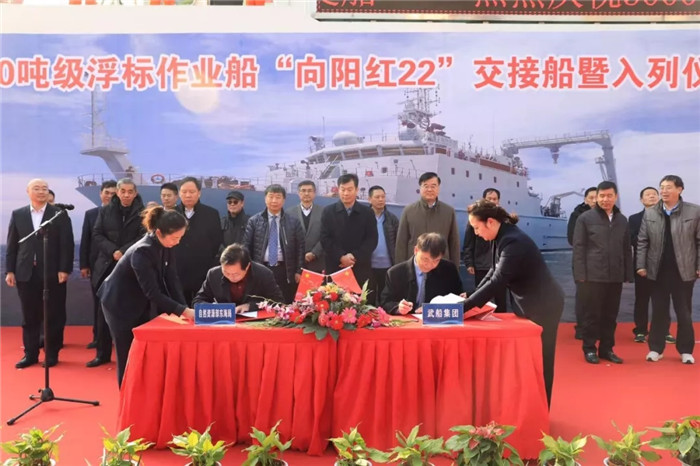 12月3日,由中國船舶武船集團建造的我國首艘3000噸級大型浮標工作船“向陽紅22”在上海順利交付。自然資源部海洋預警監(jiān)測司副司長王華,武船集團黨委書記、董事長陳?街麓牽?自然資源部東海局局長吳強宣布該船入列并向船長授旗,武船集團副總經理王渭齡主持交付儀式。