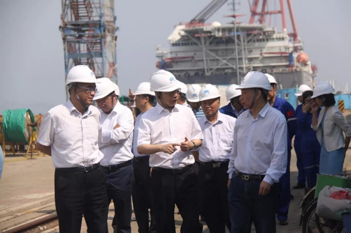 李冰一行來到青島武船碼頭生產(chǎn)區(qū)域,實地查看了正處于系泊試驗階段的4型5艘海工產(chǎn)品,并現(xiàn)場聽取了生產(chǎn)建造進展情況。