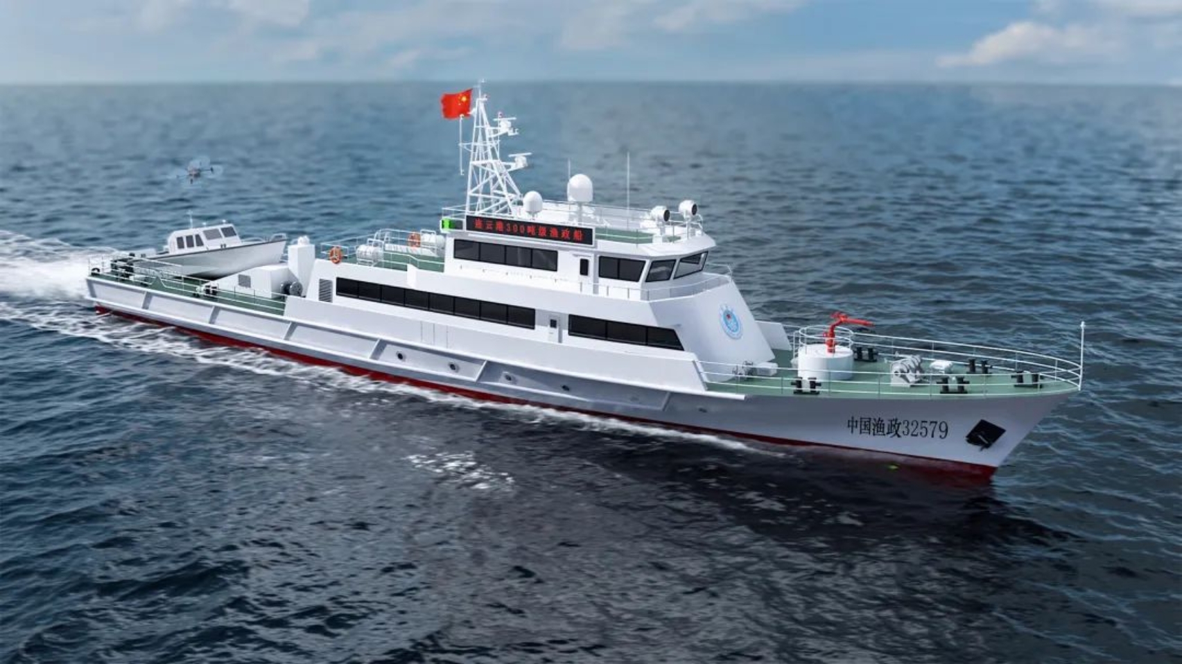 全船總長53米,型寬7.8米,型深4米,船型為深V型,傾斜船艏、方尾,采用通長甲板、雙機(jī)、雙槳,直線推進(jìn)方式;主船體為鋼質(zhì),甲板室為鋁質(zhì)。建成后將代表國家行使?jié)O業(yè)行政執(zhí)法權(quán),有效履行連云港管轄海域漁政、漁業(yè)等相關(guān)漁業(yè)行政執(zhí)法管理;滿足執(zhí)行200海里專屬經(jīng)濟(jì)區(qū)巡航管理任務(wù)的需要;兼顧漁業(yè)海難輔助救助等任務(wù)。