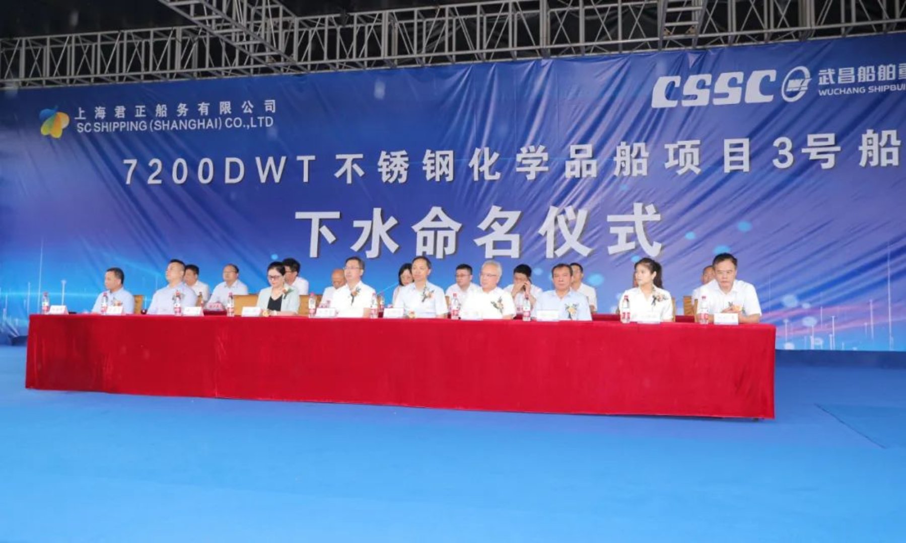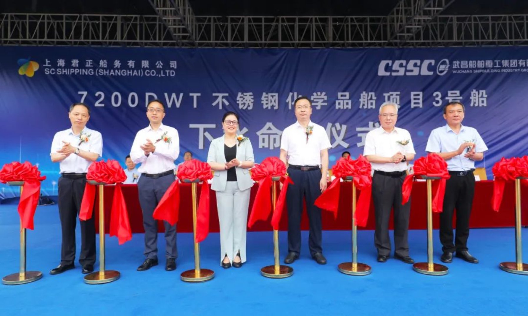 7月20日上午,在喜悅的鑼鼓聲中,由中國船舶集團武昌造船為上海君正船務(wù)有限公司建造的第三艘7200DWT不銹鋼化學(xué)品船“月丹”輪在雙柳廠區(qū)順利下水!上海君正物流常務(wù)副總經(jīng)理吳貴榮,武昌造船黨委副書記、總經(jīng)理梁師清,中國船級社副總裁范強,中海殼牌石油化工有限公司供應(yīng)鏈總監(jiān)陳鵬,上海船舶研究設(shè)計院副院長周志勇等相關(guān)領(lǐng)導(dǎo)出席儀式并剪彩。