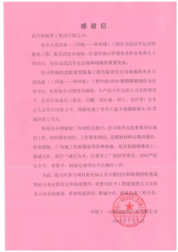 光谷大道南延(三環線?C?C外環線)工程作為武漢軍運會的配套工程,備受武漢市政府、江夏區廟山管委會和社會各界人士的關注,并肩負著武漢軍運會保障線路的重要使命。武船集團重裝公司承接的光谷大道南延(三環線?C?C外環線)工程中的GN19聯鋼箱梁制造及安裝任務,結構重量3347噸,共計82個節段,在各方人員共同努力下,圓滿完成了光谷大道主線鋼箱梁貫通的重大節點。特別是在鋼箱梁廠內制作過程中,重裝公司高度重視項目節點履約工作,組織領導到位、工作落實到位,克服了原材料訂購周期長、供貨期緊、廠內施工資源緊張等各種困難,充分發揚迎難而上,精誠合作,踐行“誠信為本,信譽至上”的經營理念,同時嚴把安全關、質量關,圓滿完成項目節點履約工作。