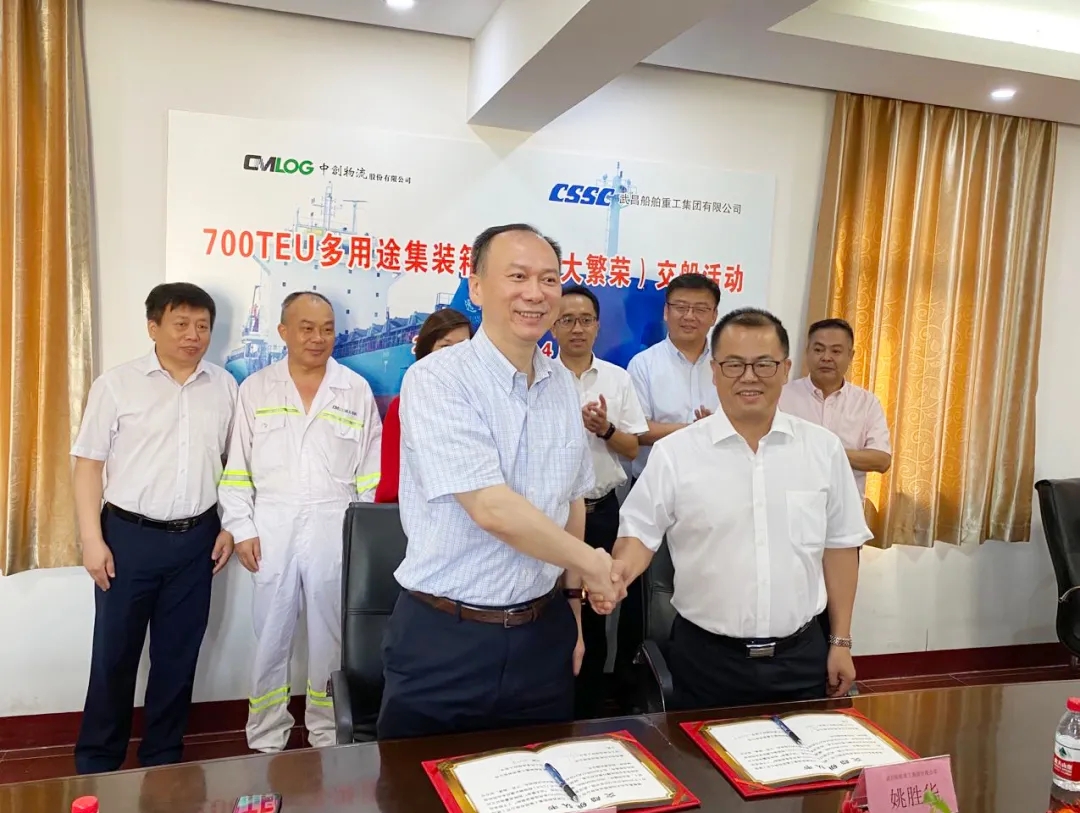 8月4日8時18分,由中國船舶武船集團(tuán)為中創(chuàng)物流青島遠(yuǎn)大均勝海運(yùn)有限公司建造的700TEU多用途集裝箱首制船(遠(yuǎn)大繁榮),在江蘇南通順利交付。中創(chuàng)物流青島遠(yuǎn)大均勝海運(yùn)有限公司董事長高兵、上海船舶研究設(shè)計院副院長周志勇、武船集團(tuán)副總經(jīng)理姚勝華出席了交船活動。