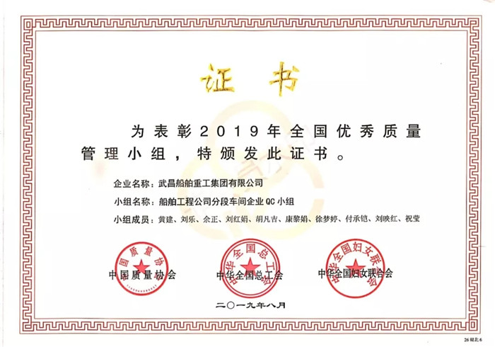 ▲船舶公司分段車間企業(yè)號QC小組獲得“2019年全國優(yōu)秀質(zhì)量管理小組”榮譽稱號