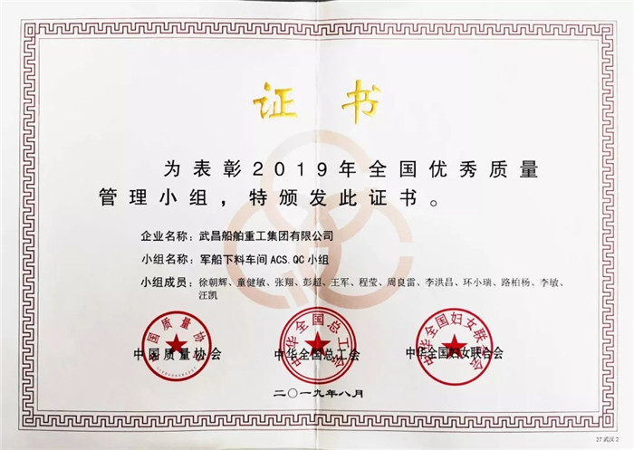 ▲軍船公司下料車間ACS.QC小組獲得“2019年全國優(yōu)秀質(zhì)量管理小組”榮譽稱號