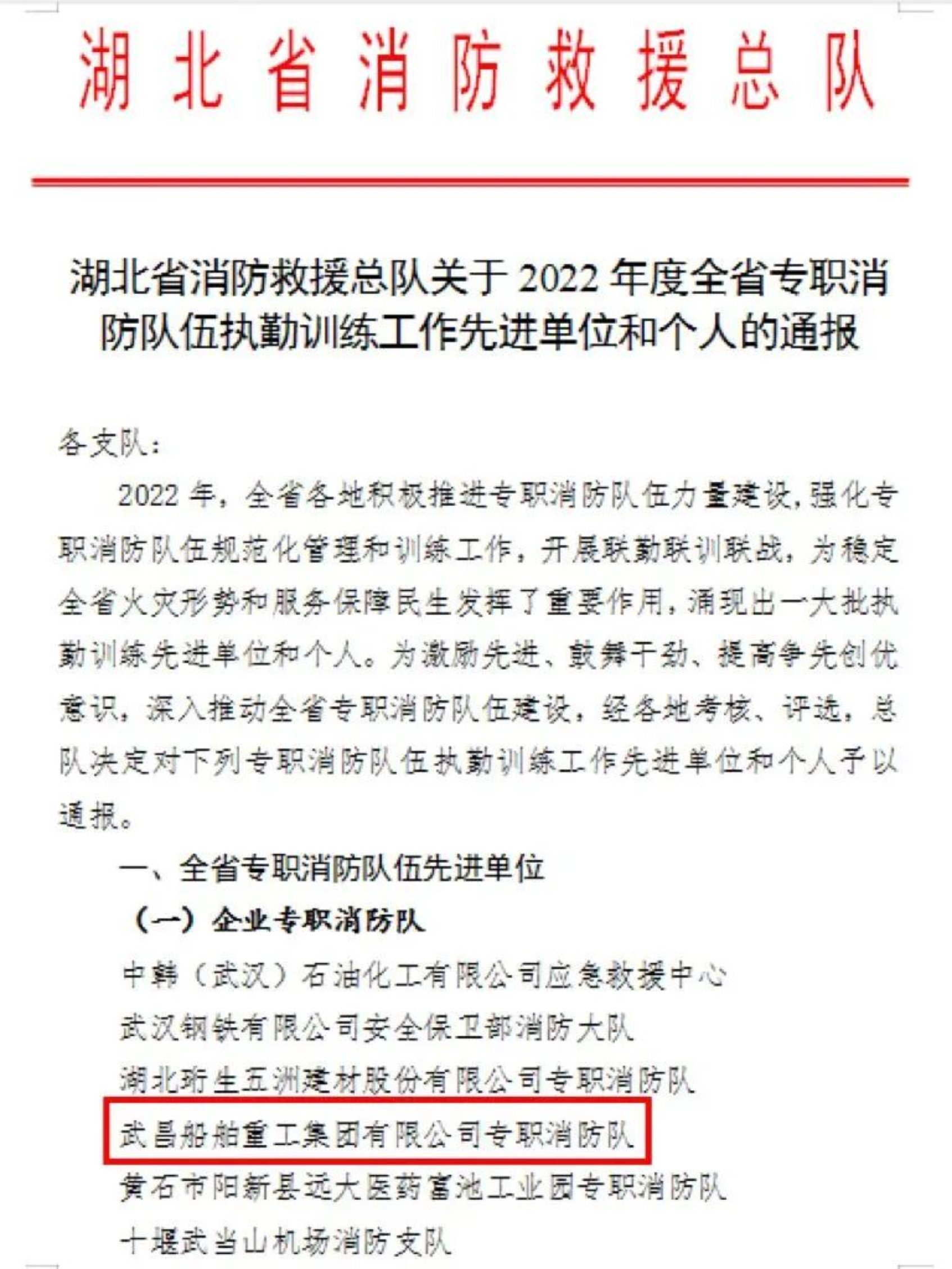 近日武昌造船專職消防隊(duì)獲得湖北省消防救援總隊(duì)授予的2022 年度全省專職消防隊(duì)伍執(zhí)勤訓(xùn)練工作先進(jìn)單位榮譽(yù)稱號