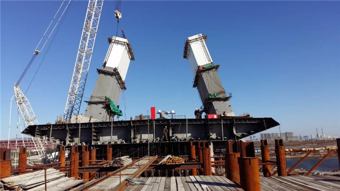 由于沿海地區(qū)風(fēng)力較大,考慮其特殊的結(jié)構(gòu)造型和現(xiàn)場施工條件的限制,武船重工股份經(jīng)過反復(fù)論證后,采取了“超大型構(gòu)件液壓同步提升施工技術(shù)”進(jìn)行豎向轉(zhuǎn)體的方式安裝,變風(fēng)險(xiǎn)較大的高空作業(yè)為地面施工,并就提升方案進(jìn)行了多次探討和實(shí)地演練,確保方案在實(shí)施過程中萬無一失,南、北側(cè)軸線偏差控制在5mm以內(nèi),各項(xiàng)指標(biāo)均達(dá)到設(shè)計(jì)要求,施工及合龍過程異常順利。該施工工藝在國內(nèi)北方沿海地區(qū)首次成功使用,大幅縮短了工期,降低了施工成本和安全風(fēng)險(xiǎn),安裝質(zhì)量和整橋受力狀態(tài)都有顯著提高。