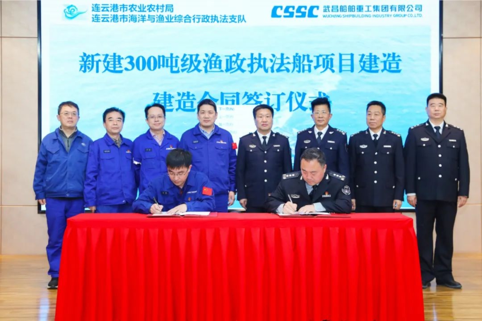 連云港市農(nóng)業(yè)農(nóng)村局副局長楊建瑞、連云港市農(nóng)業(yè)農(nóng)村局漁政處處長李海、連云港市海洋與漁業(yè)綜合行政執(zhí)法支隊支隊長張長春等領(lǐng)導(dǎo),武昌造船黨委委員、總會計師陳仲明,經(jīng)營部和船艇公司共同見證簽約。
