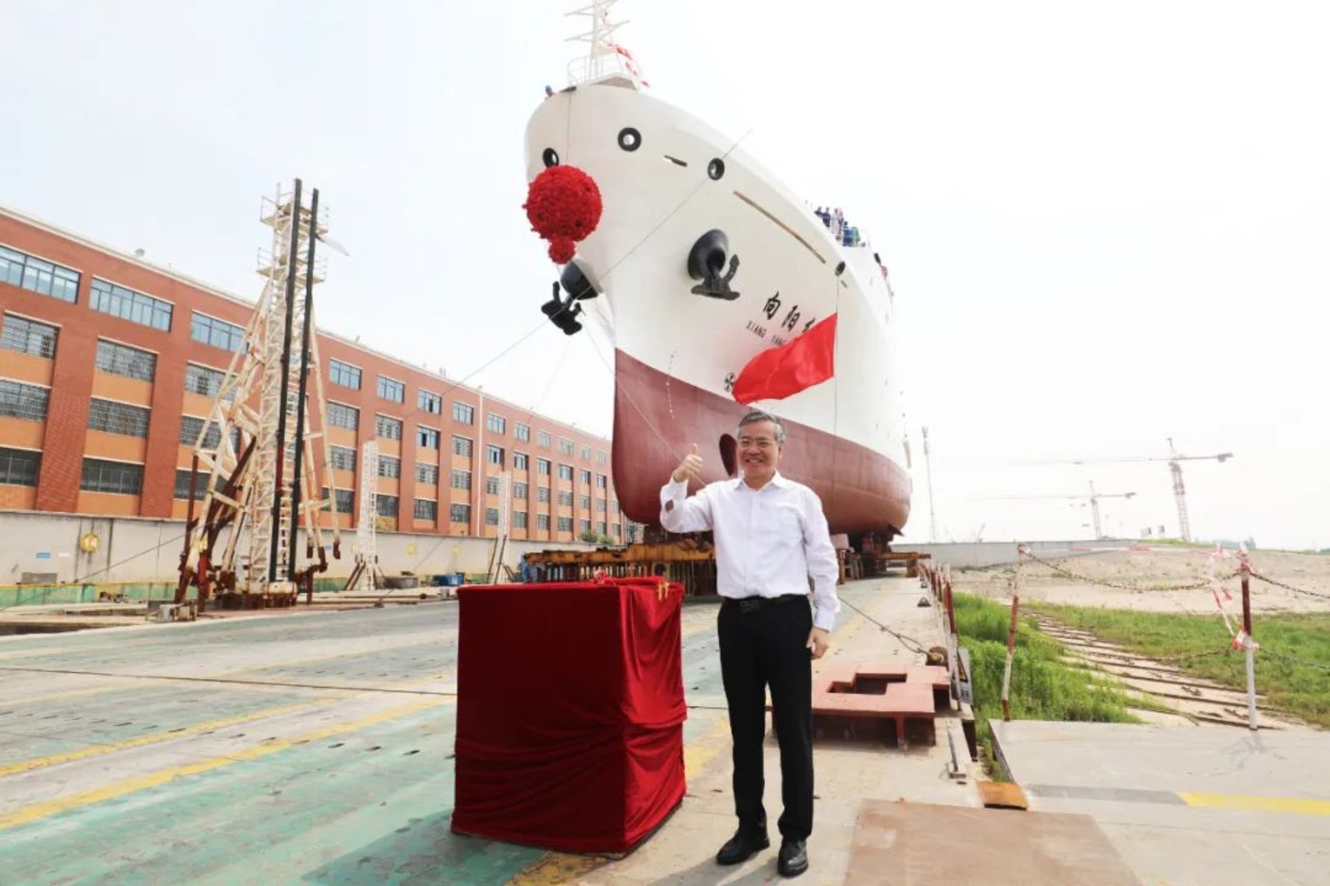 5月19日武昌造船下水滑道,彩旗招展,鑼鼓喧天,鞭炮齊鳴,9點58分,隨著船舶揭幕,擲瓶禮的完成,在眾人的觀禮中,中國船舶集團武昌造船為國家海洋局南海調查中心改造的3000噸級綜合科學考察船——“向陽紅05”船在雙柳廠區成功下水!