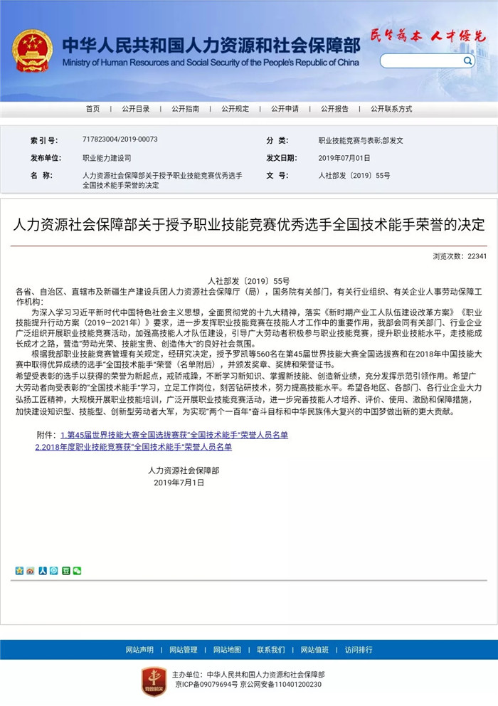 日前,人社部決定授予在第45屆世界技能大賽全國選拔賽和在2018年中國技能大賽中取得優(yōu)異成績的選手“全國技術(shù)能手”榮譽,并頒發(fā)獎?wù)隆ⅹ勁坪蜆s譽證書。