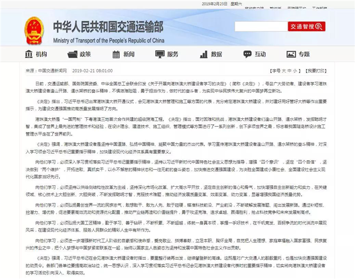 交通運輸部、國務院國資委、中華全國總工會聯合決定深入開展向港珠澳大橋建設者學習活動,號召學習港珠澳大橋建設者逢山開路、遇水架橋的奮斗精神。