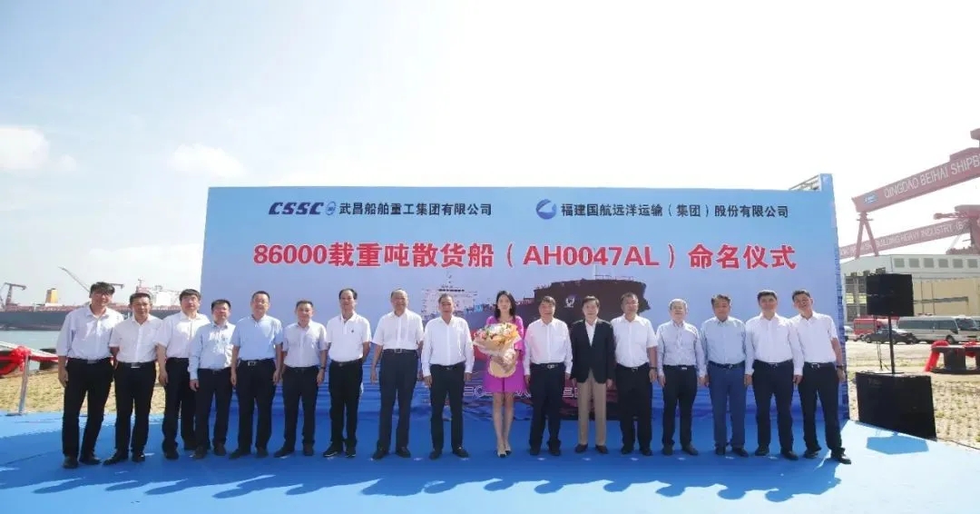 8月23日,中國船舶武船集團北船重工為福建國航遠洋運輸(集團)股份有限公司建造的86000噸散貨船首制船在北船重工3號碼頭舉行命名暨啟航儀式,北船重工總經理谷克超主持儀式,北船重工董事長王國海與福建國航副總裁韓青先后致辭,福建國航副總裁張軼女士將本船命名為“國遠82”輪,并在福建國航董事長兼總裁王炎平和武船集團董事長陳?降募?證下為本船砍纜、敲香檳酒。