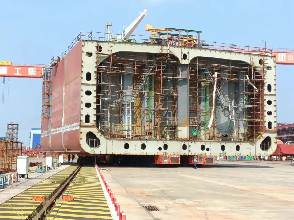 6月14日,該船一號環(huán)段總組順利轉(zhuǎn)運;6月29日,二號環(huán)段總組順利轉(zhuǎn)運,7月6日,三號環(huán)段總組順利轉(zhuǎn)運……一個月內(nèi),快速精準(zhǔn)形成2號船主船體,船臺周期相較一號船進一步縮短2個月。