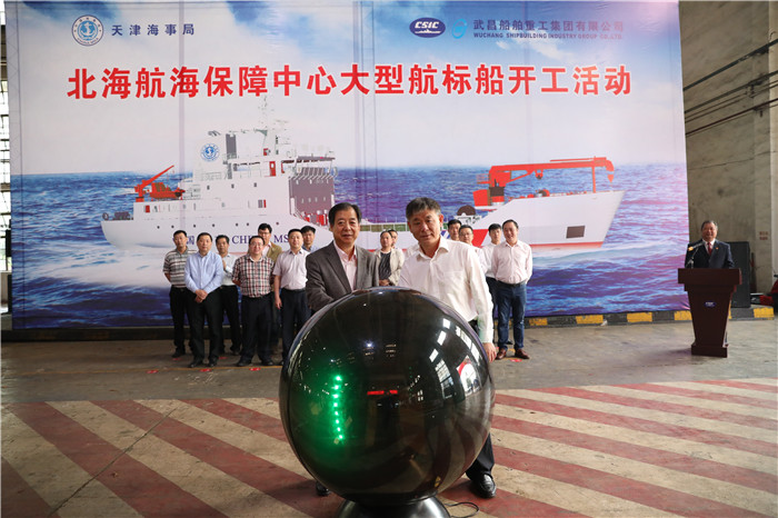2019年4月26日上午,北海航海保障中心大型航標船開工活動在武船集團船舶公司內業車間舉行。北海航海保障中心副主任李樹兵、天津海事局基建裝備處副處長姜大寧、武船副總經理王渭齡等相關單位領導及來賓參加了此次活動。