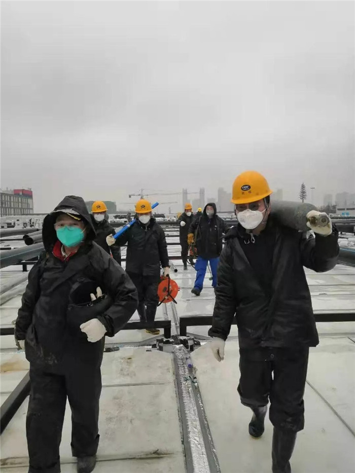 △雷神山醫院頂樓天臺現場冒雨施焊接作業