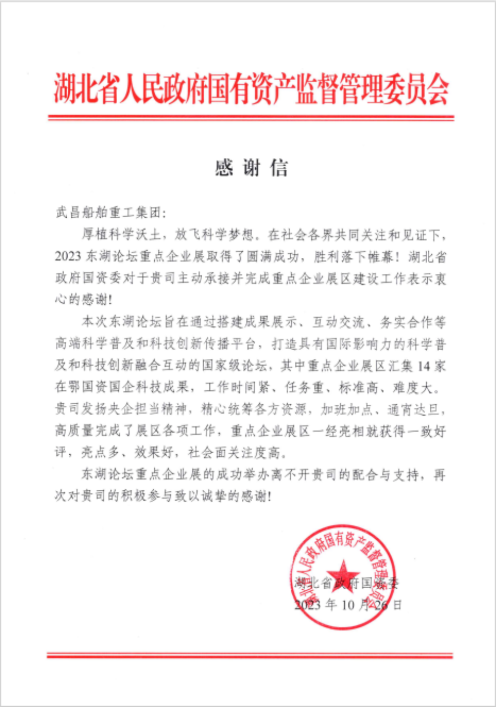 “發(fā)揚(yáng)央企擔(dān)當(dāng)精神,精心統(tǒng)籌各方資源”“亮點(diǎn)多,效果好,社會(huì)面關(guān)注度高”......這是來自湖北省政府國資委的感謝信對武昌造船的贊揚(yáng)!