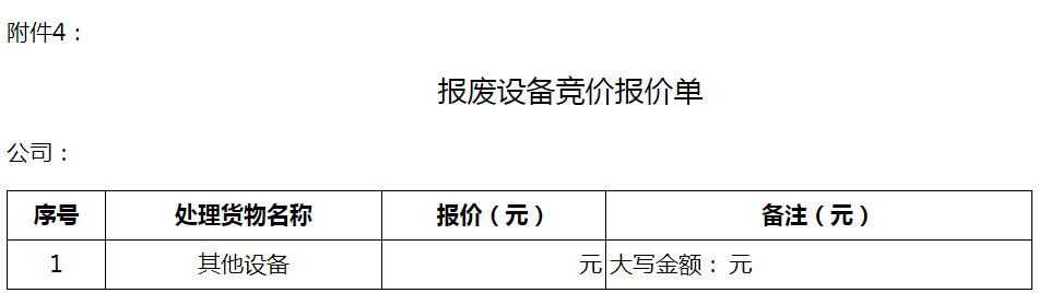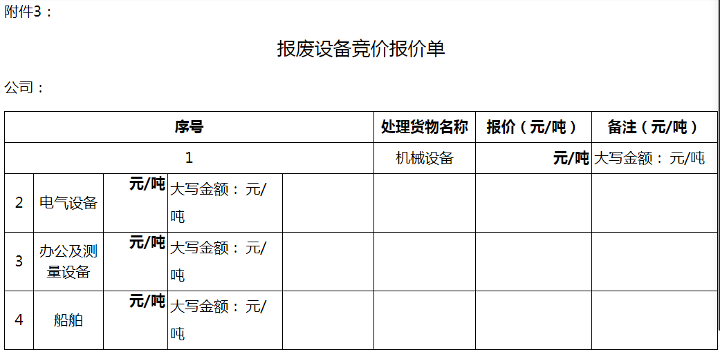 (2)報(bào)價(jià)要求:按附件3“報(bào)廢設(shè)備競價(jià)報(bào)價(jià)單”的機(jī)械設(shè)備、電氣設(shè)備、船舶、辦公及測量設(shè)備等四項(xiàng)內(nèi)容,以及附件4“報(bào)廢設(shè)備競價(jià)報(bào)價(jià)單”的其他設(shè)備分別填寫第一次報(bào)價(jià),原則上單項(xiàng)最高報(bào)價(jià)中標(biāo);若兩個及以上投標(biāo)商在同一競價(jià)項(xiàng)目的價(jià)格相同且為本次競價(jià)的最高報(bào)價(jià),則對該項(xiàng)目重新進(jìn)行現(xiàn)場報(bào)價(jià);若投標(biāo)商愿意以更高價(jià)格收購,可進(jìn)行多次現(xiàn)場競價(jià),最終確定最高中標(biāo)價(jià)格和中標(biāo)方。